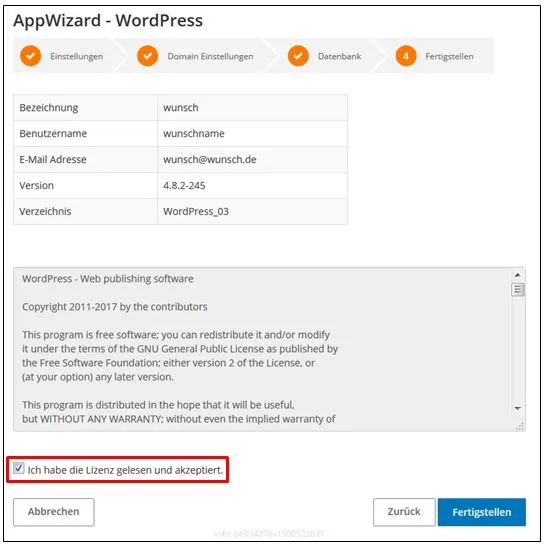 Nun brauchst du nun noch eine MySQL-Datenbank. Aber keine Sorge: diese wird automatisch erstellt. Lies im letzten Schritt noch die Lizenzbedingungen und bestätige die Option „Ich habe die Lizenz gelesen und akzeptiert“. Klicke nun auf „Fertigstellen“, so dass die Installation ausgeführt wird.