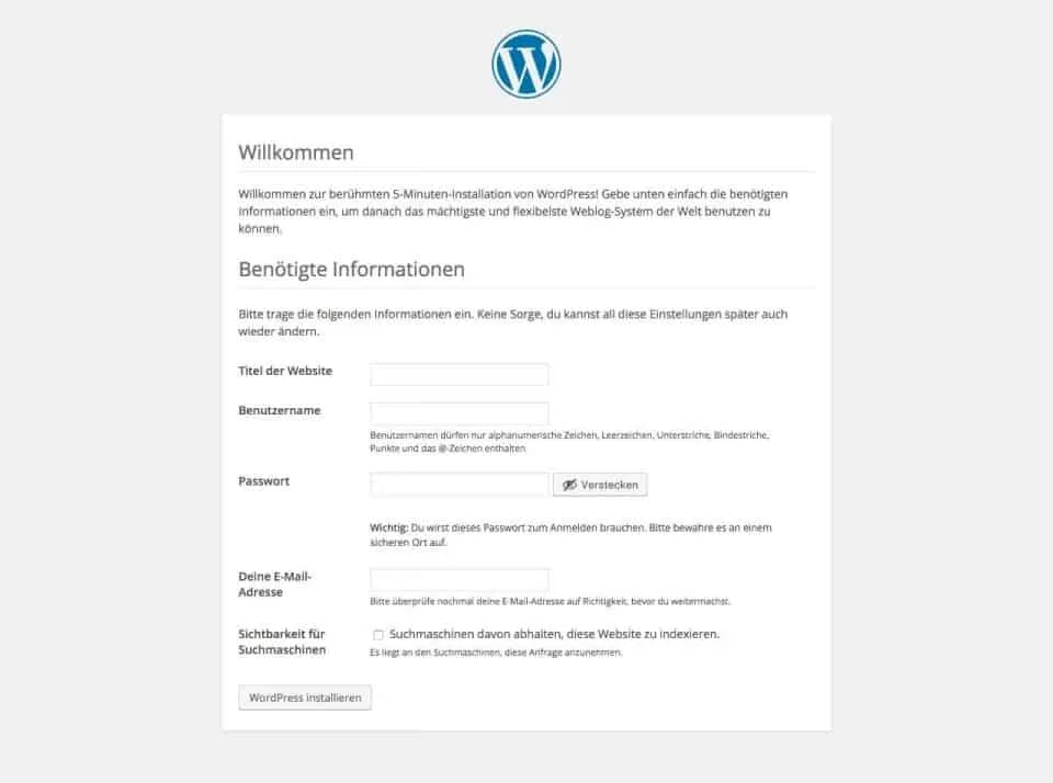 Sobald alle Datein hochgeladen sind, rufe die datei install.php in deinem Browser auf. Die Datei liegt im Ordner „wp-admin“. Der Link wird in etwa so aussehen: https://www.DEINE-WEBADRESSE.de/wp-admin/install.php Es lädt nun die WordPress-Installationsmaske. Trage hier alle geforderten Daten ein.